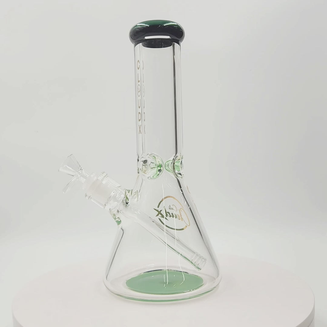Coming in at a respectable 12" tall this piece is made from thick glass with a classic beaker shape. Featuring a colored mouth piece and base, it gives this piece just a little more aesthetic appeal.